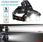 Headlamp Rechargeable Headlight with 3 Lights 4 Modes, 6000 Lumen Super Bright 【90º Adjustable & Waterproof】The headlamp can help you to see anything clear in ahead by pivoting the head down 90º to avoid the pavement cracks and obstacles. IPX5 water resistant grade, it's safe to use even when it's raining. 【Comfortable & Lightweight】Super adjustable system bands will provide maximum comfort and that balances perfectly between the front and back of your head. Never get left in the dark again as a female customer also can use this headlamp. 【Multifuctional Usages & Warranty】Extremely suitable for jogging , cycling , camping and other long time night activities. If you have any problems, please contact us and we will solve the problem in the shortest time possible. 1-year warranty and satisfaction guarantee. 【Upgraded Battery & Long Lasting】High quality 1200mAh Li-polymer battery supports 4-4.5 hours fast charge which provides for 7-8 hours using time. Due to its advanced 1*L2 + 2* R2 LED bulbs design, the battery life of a full charge in each usage is three times longer than normal headlamps. 【4 Normal Modes】 The headlamp have bright light in the middle - bright on both sides - three lights at the same time - three lights are flashing these 4 modes. Be prepared to adjust to a full range of lighting needs. Fit all adults and kids with it's stylish design Product Dimensions : 【Upgraded Battery & Long Lasting】High quality 1200mAh Li-polymer battery supports 4-4.5 hours fast charge which provides for 7-8 hours using time. Due to its advanced 1*L2 + 2* R2 LED bulbs design, the battery life of a full charge in each usage is three times longer than normal headlamps. 【4 Normal Modes】 The headlamp have bright light in the middle - bright on both sides - three lights at the same time - three lights are flashing these 4 modes. Be prepared to adjust to a full range of lighting needs. Fit all adults and kids with it's stylish design Product Dimensions : 11.8 x 11.4 x 9.9 cm Item W