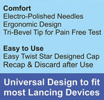 Institution / Hospital Pack 1000 Glucometer Lancets, (Blue) Universal design fits most devices. Number of Lancet : 1000 Lancet. Ultra thin TRI-BEVEL Tip - 30 Gauge Needle. Electro polished needle.