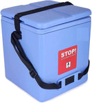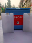 L Small Vaccine Carrier (0.80)with 2 Ice Packs CFC resistant polyurethane (Blue) Insulation thickness: 32/36mm, external dimensions (L x W x H): 25 x 18 x 21 cms, internal dimensions (L x W x H): 17 x 10 x 12 cms vaccine storage dimensions: 17 x 10 x 5.3 cms Lid type and fixings: removable, number of ice packs required and supplied: 2, ice-packs type e5/ip.: 2, Capacity of icepack: 0.40L., actual cold life without opening 43 deg c ± 1 deg. C: 19 hours 25 minutes Instructions for use: transport of vaccine by vehicles to large immunization sessions lasting more than a week Vaccine storage capacity: 0.80 ltrs., weight - fully loaded: 2.4 kgs., weight - empty (with empty icepacks): 1.4 kgs External surface material: HDPE (High Density Polyethylene), internal lining material: hips (High Impact Polystyrene), insulation material: CFC resistant polyurethane